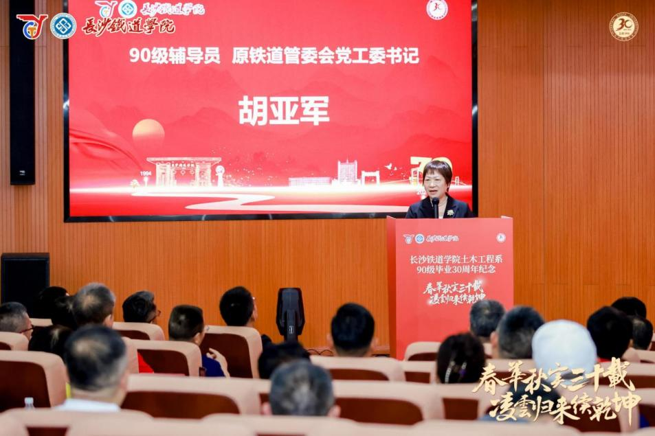 原铁道校区党工委书记胡亚军代表90级辅导员发表讲话,回忆了90级学生在校期间的学习、生活趣事。她表示对90级校友如今取得的卓越成就感到欣慰与自豪,深情地说:“在我执教生涯的37年中,当辅导员培养学生是令我最骄傲的时光”,并向90级校友送上了美好的祝愿。