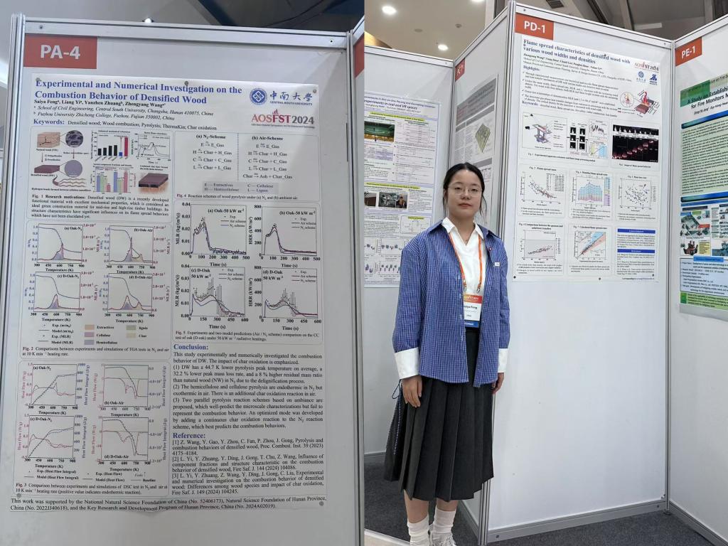 会议期间,77779193永利官网消防工程系共展出4张海报,涵盖了固体火蔓延、致密木材的阻燃性能模拟、致密木材的开裂研究、火灾风险识别算法4个不同的主题,硕士生冯赛亚在场为国内外研究人员讲解展示。