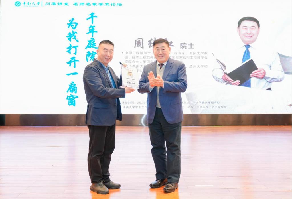 互动交流环节,周院士还悉心解答了同学们关于土木行业未来发展趋势、青年科研人员职业规划等一系列问题,展开了深入讨论交流。现场掌声雷动,同学们反响强烈,互动交流环节结束后,学生代表向周院士献上鲜花表示感谢,何旭辉副校长为周绪红院士递赠名师名家论坛嘉宾纪念牌。